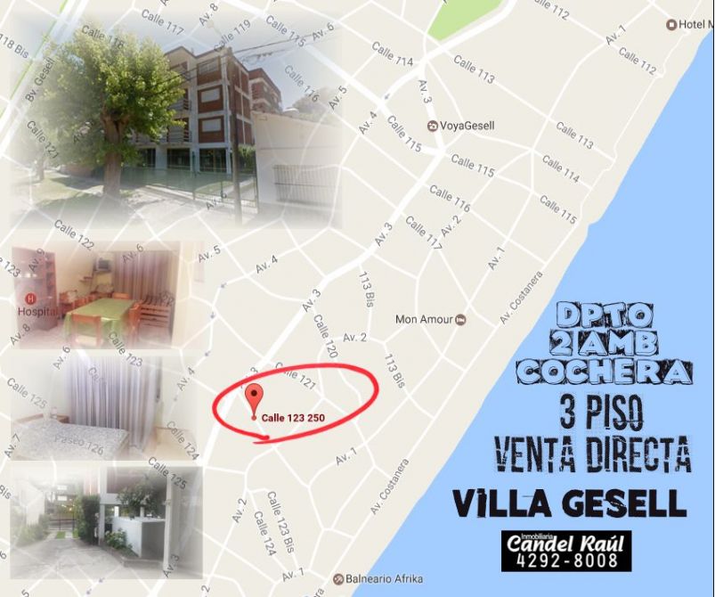 Dpto 2 amb con cochera. 3° Piso x escalera. Living comedor, baño completo, dormitorio, cocina, balcón. A 300 mtrs. del Mar. Ubicación: entre calles Av. 2 y Av. 3. VENTA DIRECTA . Buen Estado.