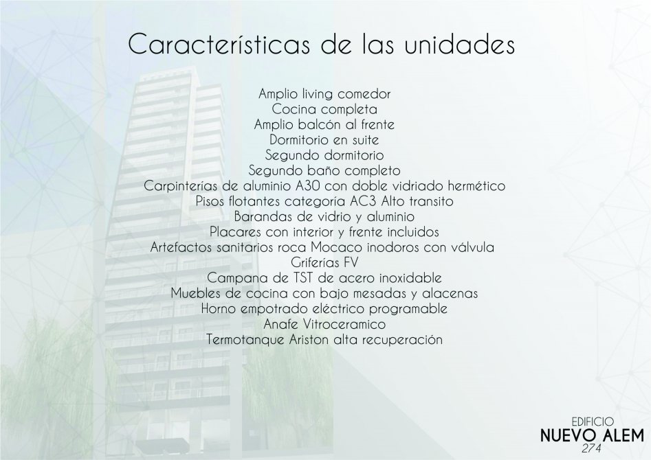 Carpinterías de aluminio H30 con doble vidrio hermético, pisos flotantes y porcelanato, revestimiento en piso, pared y baños, placard con interior y frente corredizo, artefactos sanitarios Ferrum y griferías FV o similar, muebles de bajo y sobre mesada en melamina, horno, anafe y termo eléctrico, aire acondicionado frio-calor central por unidad totalmente instalado con equipos y conductos.