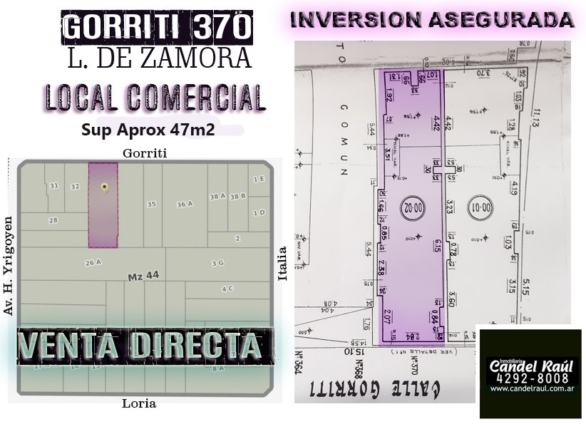 Local Comercial en Venta. Sup Aprox. 47 m2 . PB: Medidas Aprox: 2.85 x 13 mtrs. Sub. Suelo: 17 m2. Renta Actualizada. Ideal Inversión. VENTA DIRECTA. Excelente Ubicación: Entre calles Italia y Av. H. Yrigoyen.
