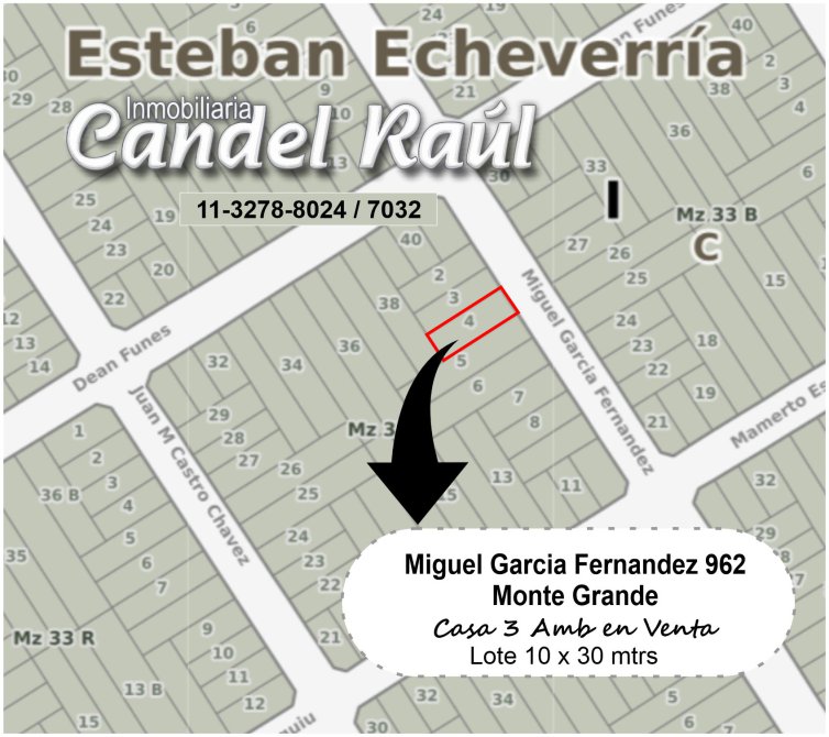 Propiedad en Venta de 3 Amb. Sup. Lote 300 m2. (10 x 30). Distribución Estilo Americano. Consta de Comerdor (3.60 x 3.50), 2 dormitorios (3.30 x 3.50), baño (1.50 x 2.00), hall distribuidor y cocina (3.60 x 3.50). Garage (2.50 x 5.45). Espacio Libre al fondo. Ubicación entre calles Dean Funes y Fray Mamerto Esquiú. VENTA DIRECTA. A 150 MTRS. De Av. V. Fair (Monte Grande)